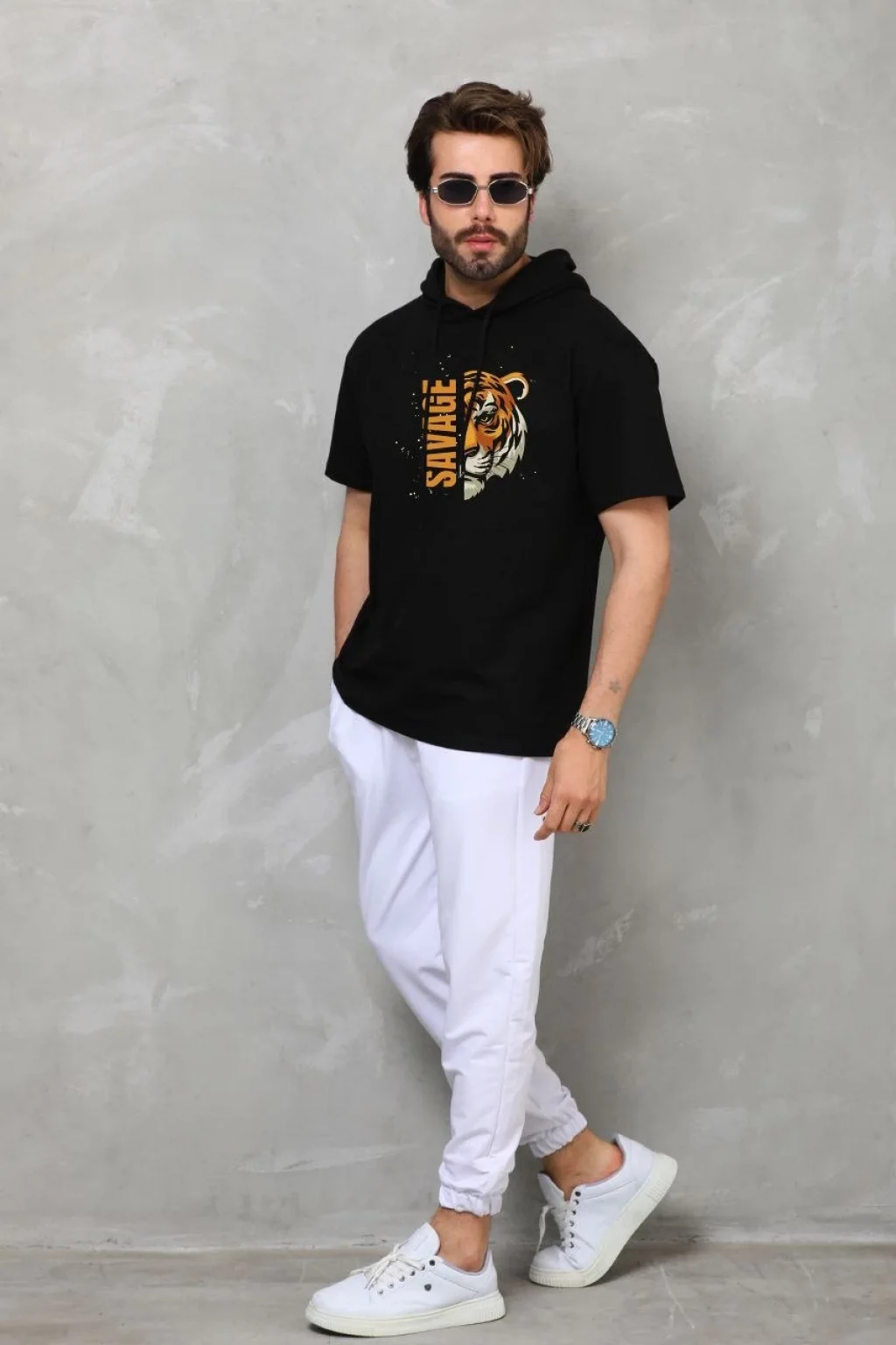 Unisex Kapşonlu Kısa Kol Oversize Baskılı T-Shirt - Siyah