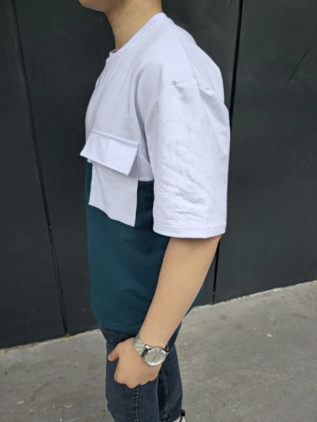 Unisex Torba Cep Detaylı Parçalı T-Shirt - Lacivert