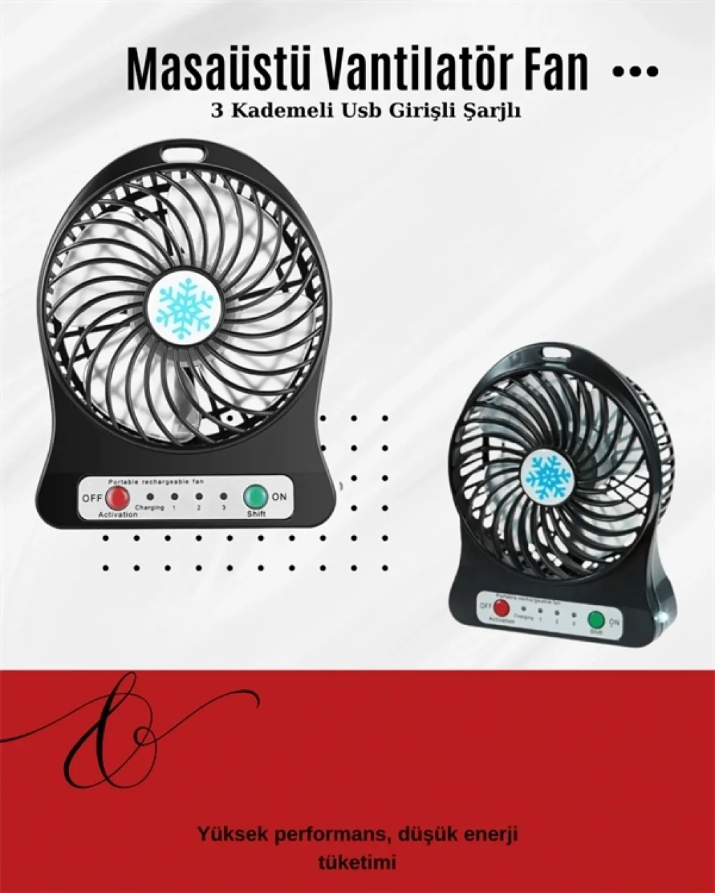 USB Girişli Taşınabilir Masaüstü Mini Fan – 3 Kademeli Hız, Şarjlı, Işıklı, Sessiz Çalışma