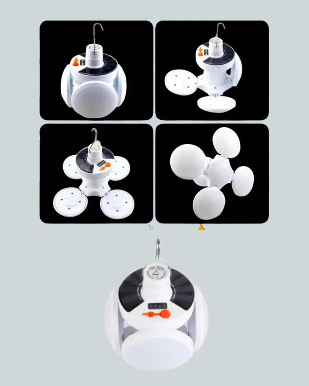 Bu çok yönlü kamp lambası, uzaktan kumanda ile kontrol edilebilen 5 farklı aydınlatma moduna sahiptir. Katlanabilir LED panelleri 90 dereceye kadar açılabilir ve 360 derece ışık yayılımı sağlar. Güneş paneli sayesinde dış mekanlarda kolay şarj edilebilirken, USB girişi ile de elektrikli şarj imkanı sunar.Yüksek kapasiteli lityum iyon bataryası ile uzun süreli aydınlatma sağlar. Su sıçramalarına karşı IPX4 koruması bulunan cihaz, yağmurlu ya da nemli ortamlarda güvenli şekilde kullanılabilir. Asılabilir kancası sayesinde çadırlara, tavanlara veya dallara kolayca monte edilebilir. Kamp, gece balıkçılığı, piknik ve elektrik kesintilerinde pratik bir çözümdür.