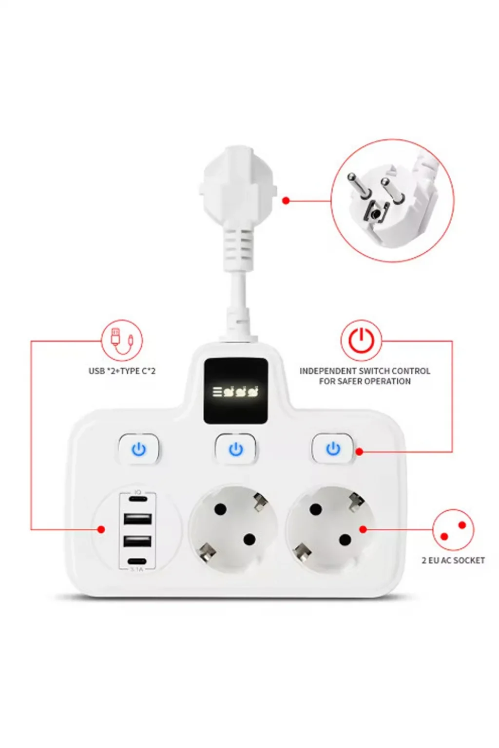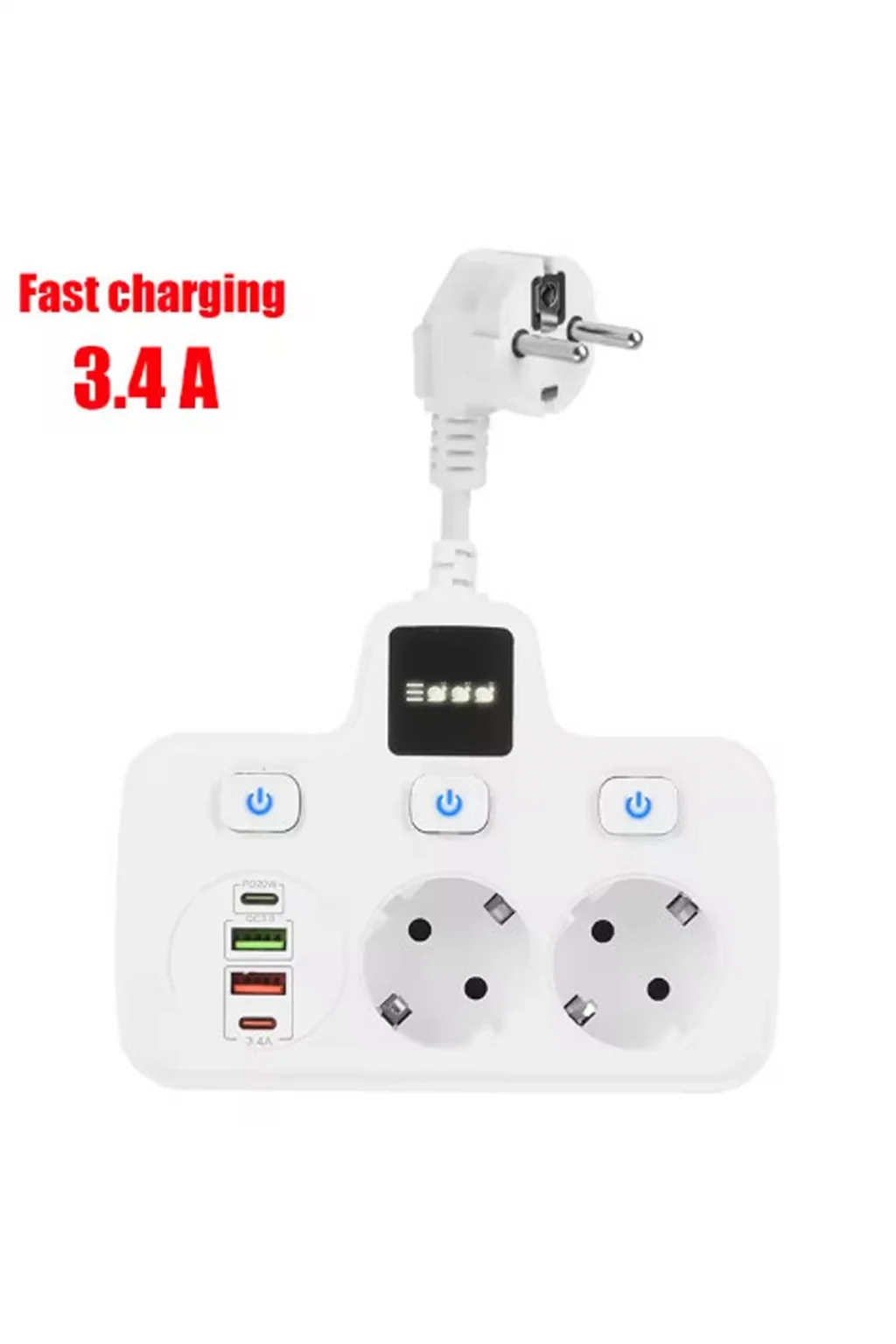 Çok yönlü ve verimli: bu güç şeridi sadece elektronik cihazlar için güç sağlamakla kalmaz, aynı zamanda cihazlarınızı USB bağlantı noktaları üzerinden şarj etmenizi sağlar. Tüm şarj ihtiyaçlarınız için çok yönlü ve verimli bir çözümdür.