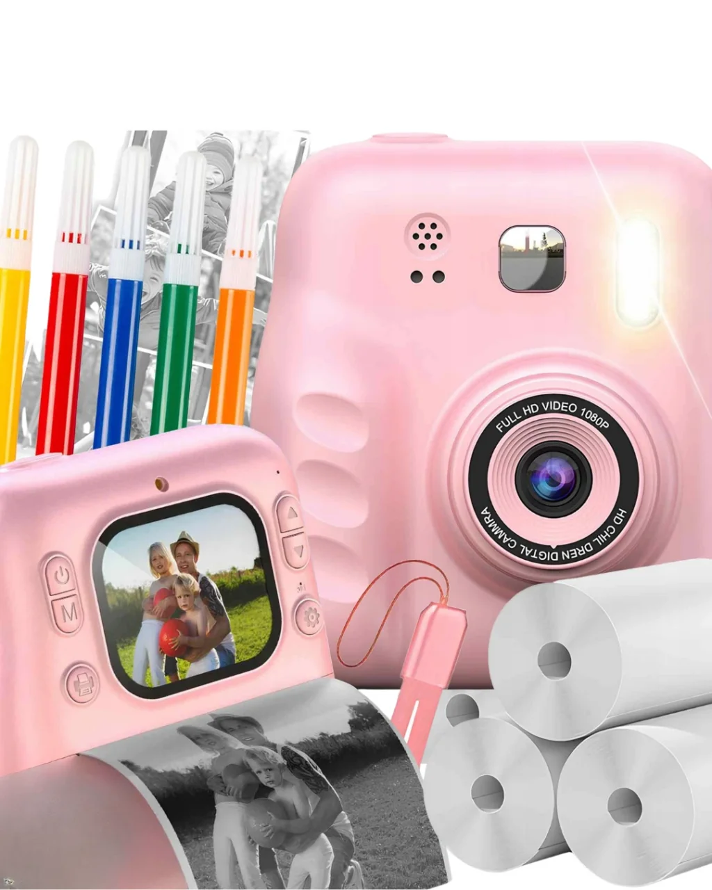 Çocuklar için özel olarak tasarlanan bu fotoğraf makinesi, onların yaratıcılığını geliştiren ve eğlenceli vakit geçirmelerini sağlayan çok yönlü bir üründür. Fotoğraf çekme, video kaydetme ve anında baskı özelliklerinin yanı sıra kutu içeriğinde bulunan 4 rulo baskı kağıdı ve 5 adet renkli kalem hediyesi ile dikkat çeker.Anında baskı özelliği sayesinde çocuklar çektikleri fotoğrafları saniyeler içinde elde edebilir. Bu fotoğrafları boyayarak daha eğlenceli hale getirebilirler. Termal baskı teknolojisi sayesinde mürekkep gerektirmez ve ekonomik kullanım sağlar.HD ekranı ile görüntüler net bir şekilde izlenebilir. Kullanımı oldukça basittir ve çocuklar için uygundur. Ön ve arka kamera desteği ile çok yönlü çekim imkanı sunar.Hafif ve taşınabilir yapısı sayesinde her yerde kullanılabilir. Dayanıklı yapısı ile uzun ömürlüdür.Hafıza kart desteği ile içerikler saklanabilir ve farklı cihazlara aktarılabilir.Yanında sunulan hediyeler ile birlikte bu ürün, çocuklar için hem eğlenceli hem de öğretici bir deneyim sunar ve mükemmel bir hediye seçeneği oluşturur.