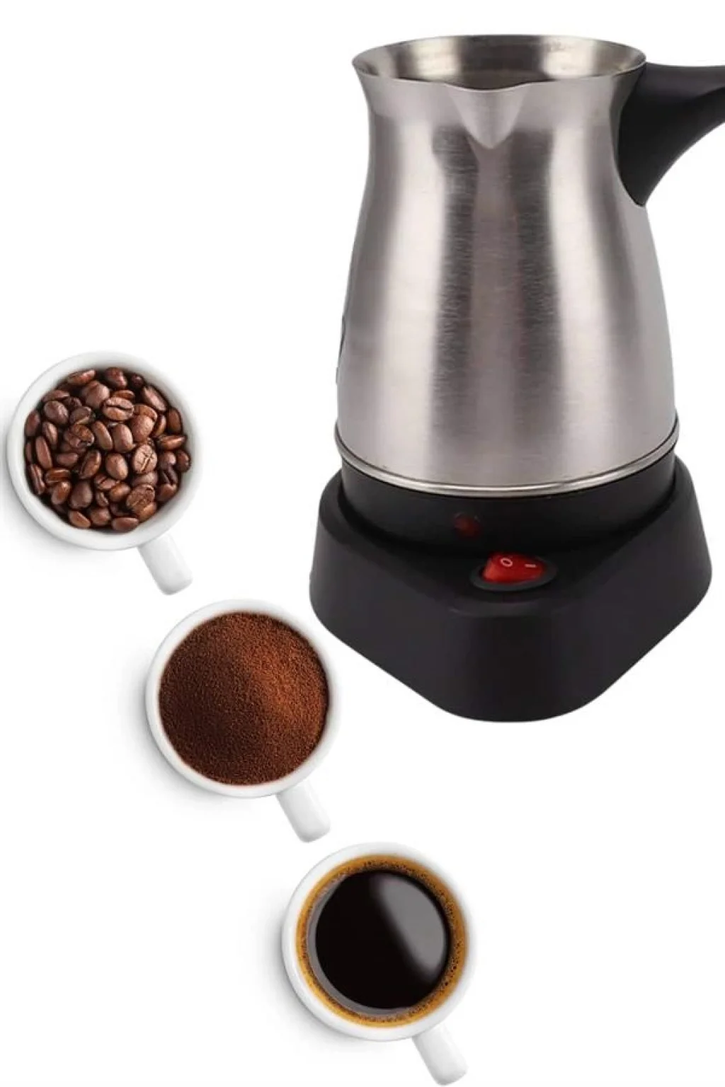 Bu elektrikli cezve, 800 watt gücüyle yüksek performans sağlar ve mükemmel Türk kahvesi deneyimi sunar. 360 ml kapasitesi ile 6 fincana kadar kahve hazırlayabilirsiniz, böylece kalabalık misafirlerinize veya büyük aile yemeklerinde kolayca kahve ikram edebilirsiniz. Gizli rezistans teknolojisi, hızlı ısınma ve güvenli kullanım sağlar, ayrıca temizlik açısından da büyük kolaylık sunar.360 derece dönebilen kablosuz tabanı, rahat bir kullanım sağlar ve her açıdan kolayca hareket etmenize olanak tanır. Paslanmaz çelik gövdesi, hem dayanıklı hem de estetik açıdan şık bir görünüm sunar. Kolayca temizlenebilen tasarımı, hijyenik bir kullanım imkanı tanır ve her seferinde taze kahve hazırlamanızı sağlar.Cezvenin üzerinde bulunan kırmızı güç düğmesi ile açma ve kapama işlemleri son derece basittir. Isınmayan ergonomik kulpu ise güvenli ve rahat bir tutuş sağlar. Paslanmaz çelik yapısı, uzun ömürlü kullanım ve şık bir tasarım sunarak mutfağınıza zarif bir dokunuş katar.Bu elektrikli cezve, Türk kahvesi sevenler için mükemmel bir seçimdir. Hem işlevsel hem de estetik özellikleriyle kahve hazırlama deneyiminizi daha pratik ve keyifli hale getirir. 6 fincana kadar kapasitesiyle geniş aileler ve misafirler için ideal bir yardımcıdır.