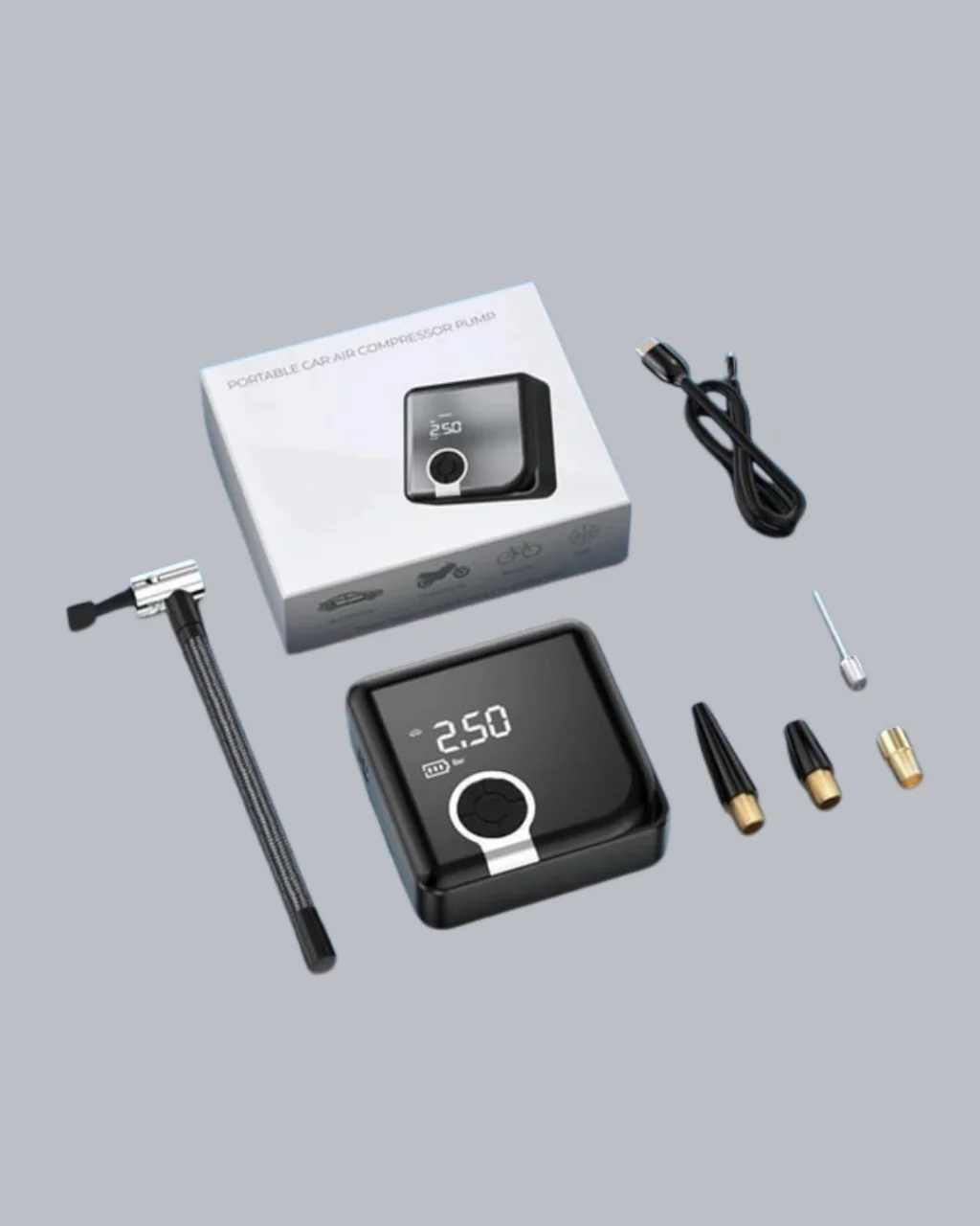 Taşınabilir kablosuz hava kompresörü, modern yaşamın ihtiyaçlarına uygun olarak tasarlanmıştır. Kompakt boyutu ve güçlü motoruyla lastiklerinizi hızlıca şişirir. 150 PSI kapasitesi ile otomobil, motosiklet, bisiklet ve şişme ürünler için güvenilir bir çözümdür.Dijital ekranı sayesinde basıncı hassas bir şekilde ölçebilir ve önceden ayarlayabilirsiniz. Cihaz ayarladığınız değere ulaştığında otomatik kapanarak güvenli bir kullanım sunar.6000 mAh bataryası güçlü ve uzun süreli kullanım sağlar. Tek şarjla dört lastiği şişirme kapasitesine sahiptir. Type-C girişli şarj özelliği sayesinde hızlı ve güvenli şarj imkanı sunar. SOS ışıkları ve LED aydınlatmaları sayesinde gece veya acil durumlarda ekstra güvenlik sağlar.Dayanıklı gövdesi uzun ömürlü kullanım için tasarlanmış olup, hafif yapısı sayesinde kolay taşınabilir. Şişme yataklar, kamp ürünleri ve spor topları için de kullanılabilmesi, bu ürünü çok yönlü hale getirir. Her araçta mutlaka bulunması gereken akıllı bir yardımcıdır.